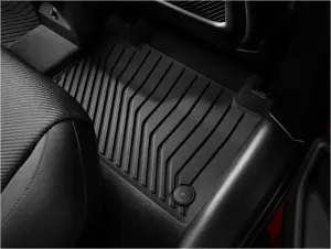 Audi e-tron All-Weather rubber floor mats are made from a pollutant free compound, and shaped perfectly to fit the floor of your Audi. These units are designed to protect vehicle carpet from snow, sand, mud, rain and slush, and feature positive retention clips and a nibbed back, ensuring that the Audi All-Weather mats stay in place.